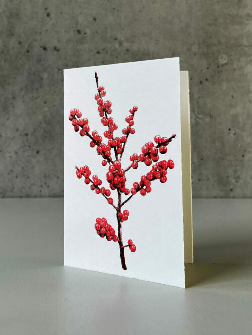 Klappkarte, 300 g naturweiß mit Büttenrändern, Handsiebdruck zweifarbig, 10 x 15 cm (Maße im zusammengeklappten Zustand).